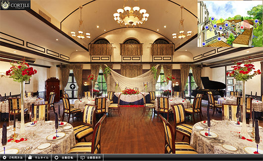 ウェディングパレス コルティーレ茅ヶ崎様 バーチャルツアー 2011-10-01 制作実績 360 神奈川県茅ヶ崎市にある結婚式場コルティーレ様のバーチャルツアーを制作させていただきました。ipad,iphone,androidでも閲覧が可能です。 360パノラマビューのwebページはこちら