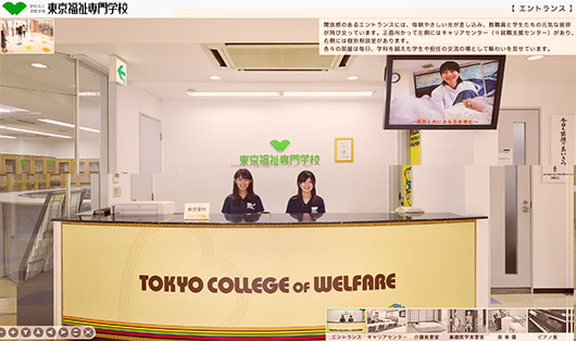 東京福祉専門学校様 360°校舎見学 2012-05-29 制作実績 360 西葛西にある東京福祉専門学校様の校舎(エントランス・教室)などをパノラマで見学することができます。各パノラマに授業内容テキストや授業風景の写真を入れてより分かりやすいバーチャルツアーになっています。 360°校舎見学のwebページはこちら